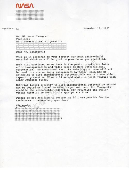 NASA映像のコマーシャルへの使用許可証 1987.11.16