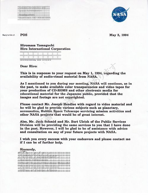 NASA映像の使用許可証 1994.5.1