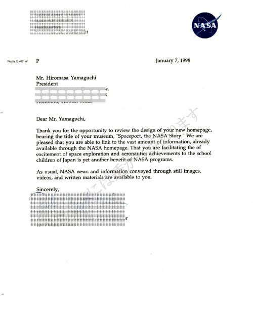 NASAのホームページの使用許可証 1998.1.7