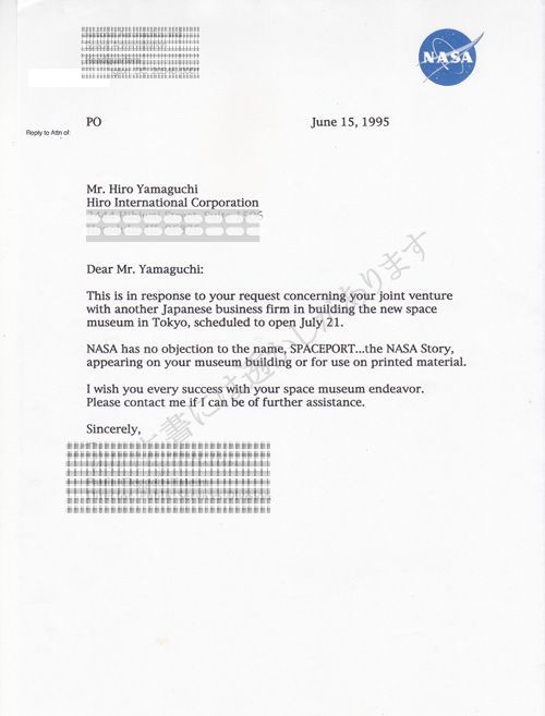 NASAミュージアム設立許可証 1987.4.7